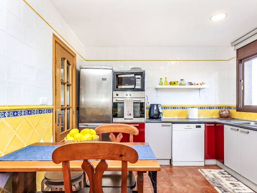 Kitchen equipped with refrigerator, microwave, oven, freezer, washing machine, dishwasher, crockery/cutlery, kitchen utensils, toaster and kettle.