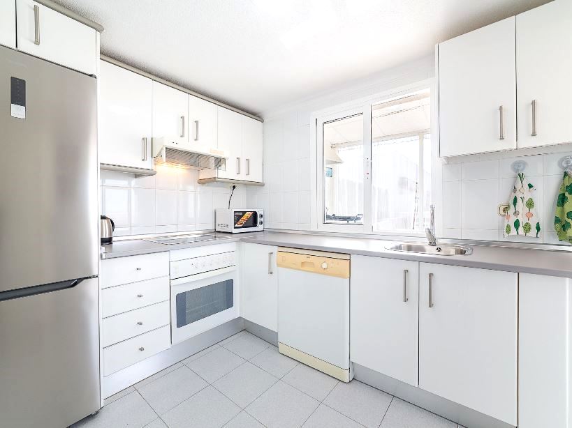The kitchen is equipped with a refrigerator, microwave, oven, freezer, washing machine, dishwasher, crockery/cutlery, kitchen utensils, toaster and kettle.